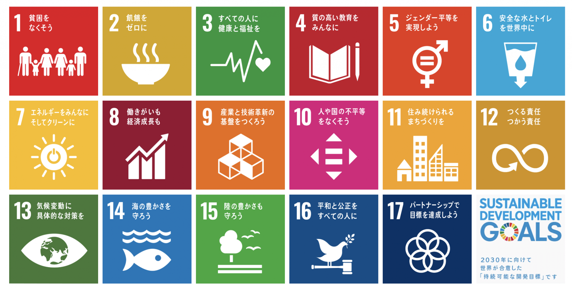 持続可能な世界を実現するための17のゴール・169のターゲットから構成され、地球上の誰一人として取り残さない(leave no one behind)ことを誓っています。
